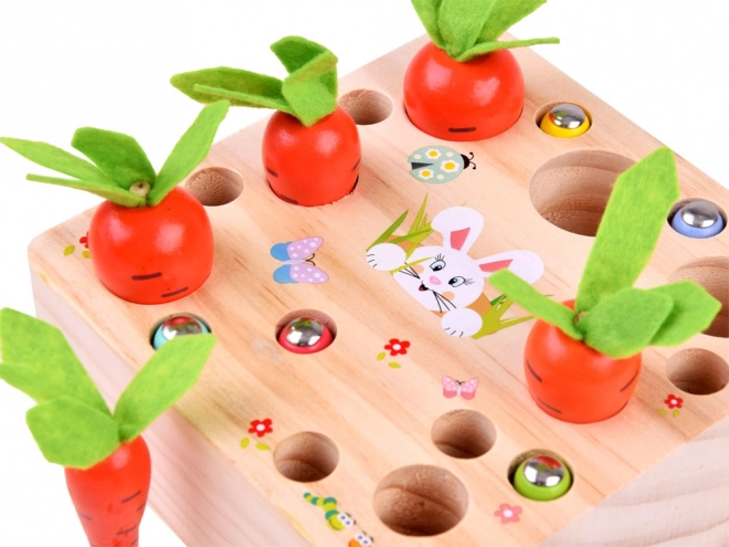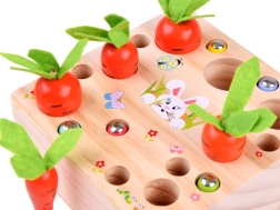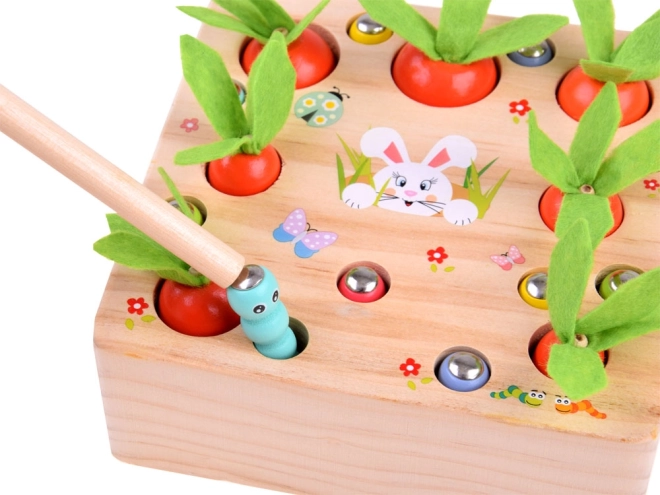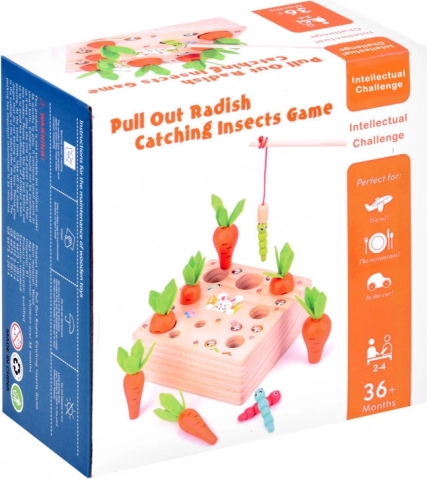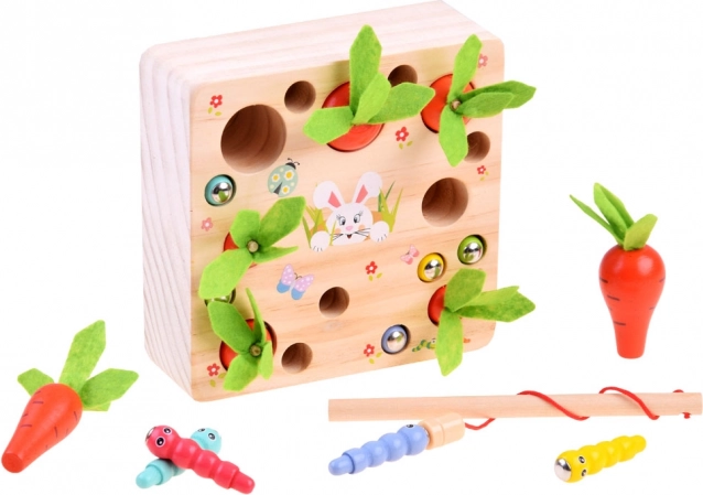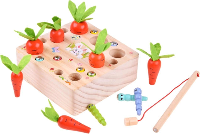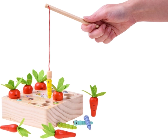 Het houten spel met worteltjes en wormpjes is ontworpen voor de allerkleinsten, met aantrekkelijke kleuren en vrolijke motieven. Kinderen kunnen op speelse wijze wortels en wormpjes oogsten met magnetische hengels, wat hun hand-oogcoördinatie en fijne motoriek versterkt.