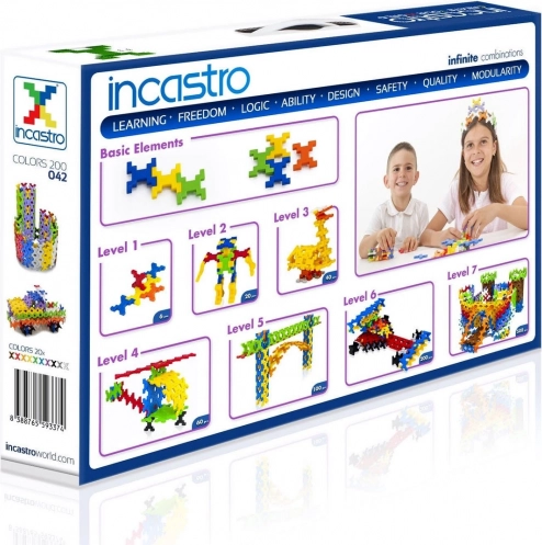 Ontdek de wereld van creativiteit met de INCASTRO-bouwset met 200 stukjes in 10 kleuren. Het unieke koppelingssysteem maakt het mogelijk om 2D-mozaïeken, 3D-modellen en bewegende constructies te bouwen. Uitstekend voor de ontwikkeling van de fijne motoriek, ruimtelijk inzicht en creativiteit. Kwalitatieve afwerking, veilige randen en een stabiele verbinding van de stukjes.