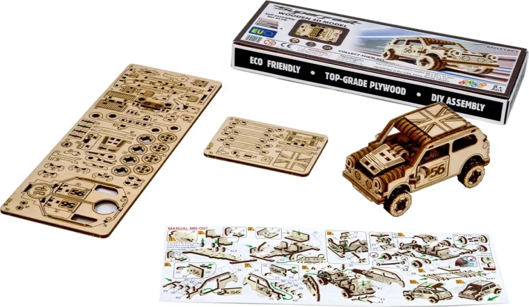 De set bevat 98 onderdelen en je zet hem in ongeveer 40 minuten in elkaar. De moeilijkheidsgraad is gemakkelijk, waardoor het model een perfecte start is in de wereld van houten bouwpakketten en een fijn project voor een gezellige familiez avond. Dankzij de compacte afmetingen (84 × 39 × 41 mm) kun je hem vrijwel overal neerzetten.