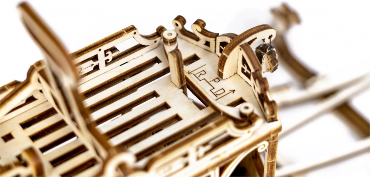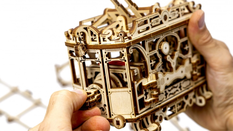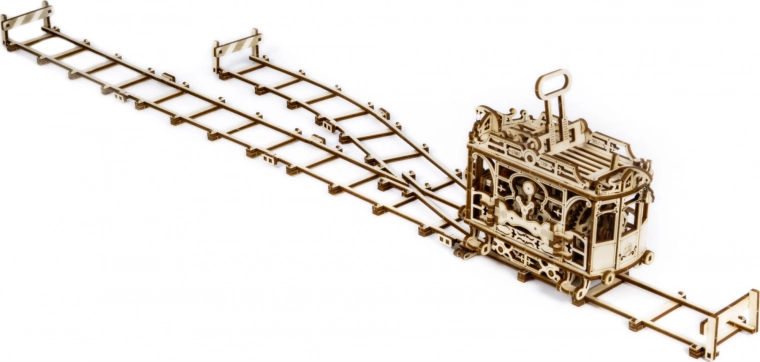 Deze nauwkeurig uitgesneden tram van berkenmultiplex biedt een authentieke mechanische ervaring – van tandwielen en overbrengingen tot de elastiekmotor. Na montage rijdt de tram over de meegeleverde rails en verrast je met soepele werking en een elegant design.