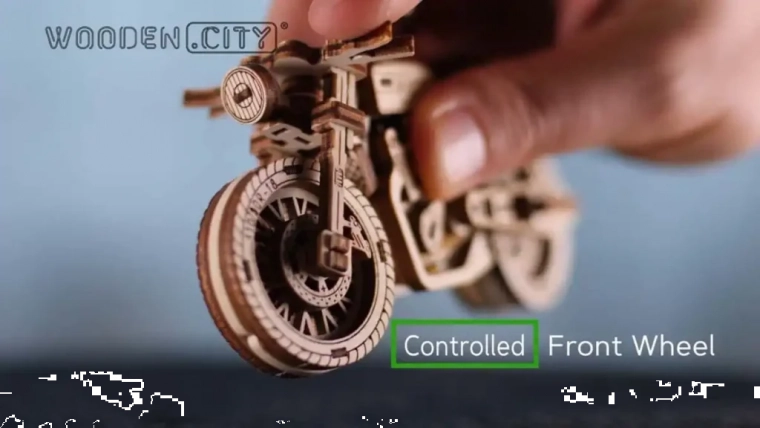 De Café Racer-motor van WOODEN CITY is een gedetailleerd houten model op schaal 1:16 dat je bureau of vitrinekast tot leven brengt. Dankzij de elastiekmotor en de terugtrekfunctie beweegt het model voor- en achteruit, haalt het een afstand van ongeveer 1 meter en biedt het zicht op echte tandwielmechanica.