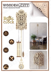 De houten 3D-puzzel WOODEN CITY Koninklijke klok is een prachtig meesterwerk met geavanceerde details en elegante lijnen. Een ideaal cadeau voor liefhebbers van schoonheid en verrassingen. Het model is geïnspireerd op de rococostijl en bevat gedetailleerde uitgesneden verstrengelde patronen. De Koninklijke klok is ontworpen om te functioneren als een echte tijdmeter met een aanpasbare slingerperiode, die afhangt van het aantal ingelegde munten.
