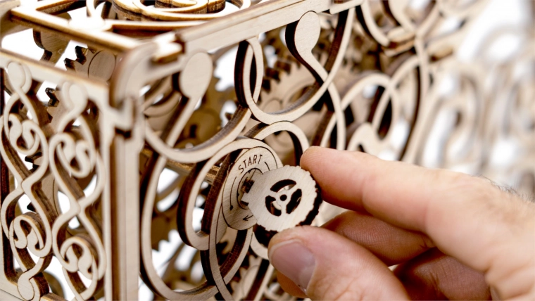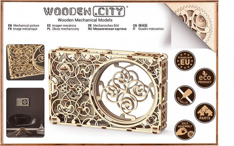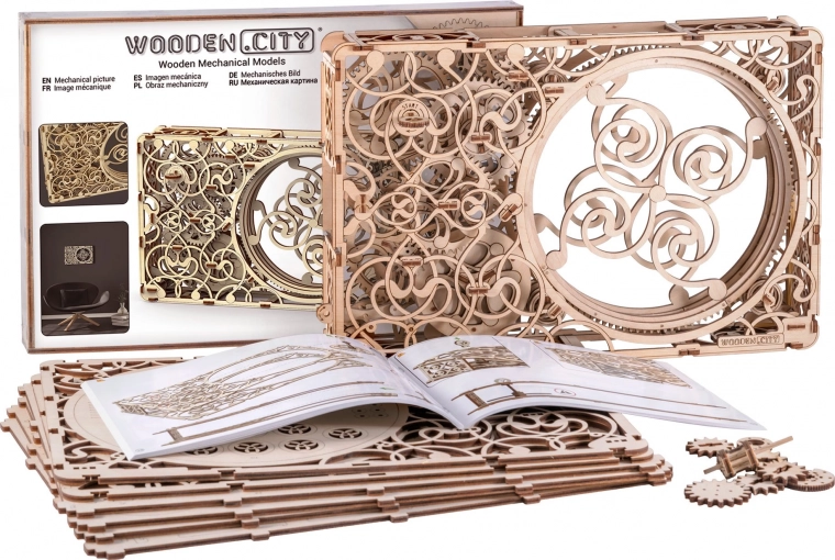 Wij presenteren u een uniek mechanisch schilderij van WOODEN CITY, dat betovert door zijn verfijning en functionaliteit. Deze houten 3D-puzzel verenigt schoonheid, wetenschap en kunst in één. Na montage komt het tot leven dankzij een speciale sleutel en toont het de beweging van tandwielen die, als in een dans, harmonieus bewegen volgens wiskundige berekeningen.
