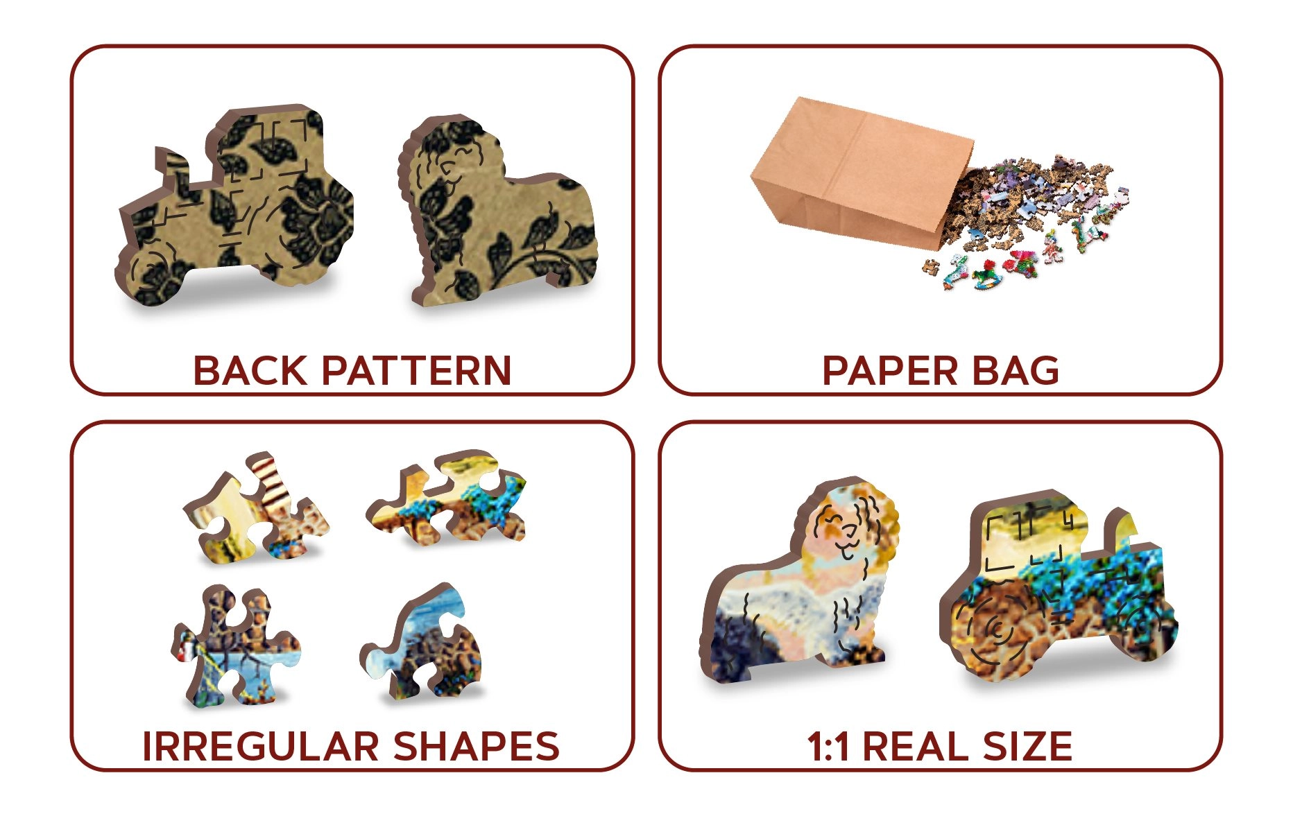Het leggen van een puzzel met verschillend gevormde stukjes is moeilijker en vormt een grotere uitdaging dan het leggen van een klassieke puzzel. De puzzel is bovendien dubbelzijdig: je kunt leggen op basis van de afbeelding (voorkant) of op basis van de vormen (achterkant met patroon). Het merk WOODEN CITY vergeet naast het unieke puzzelconcept de ecologie niet: bij deze producten vind je geen plastic verpakkingen. Met uniek gevormde stukjes die bekende gebouwen, objecten of dieren uitbeelden volgens het thema van het motief. Hogere moeilijkheidsgraad bij een kleiner aantal stukjes – het leggen van een puzzel met verschillend gevormde stukjes is veeleisender.