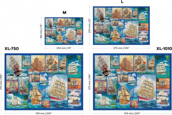 Je kunt puzzelen op afbeelding of op vorm: met een motief van zeilboten aan de ene kant en een herhalend patroon aan de andere kant.