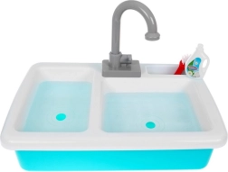 Deze unieke kindergootsteen biedt niet alleen de mogelijkheid om een echte keukenwasbak na te bootsen, maar stimuleert ook spel en de ontwikkeling van gewoontes. Na het vullen van het reservoir met water en het draaien aan de kraan stroomt er een zachte waterstraal, zodat ouders zich geen zorgen hoeven te maken over rommel. De gootsteen is ideaal voor jongens en meisjes en biedt een realistische speelervaring.