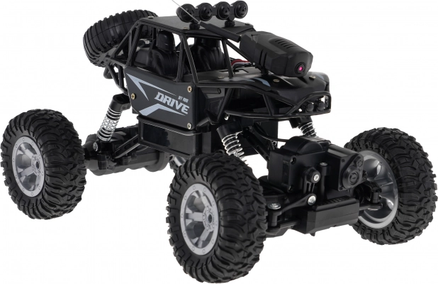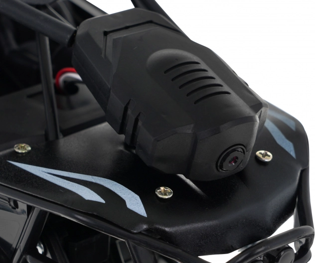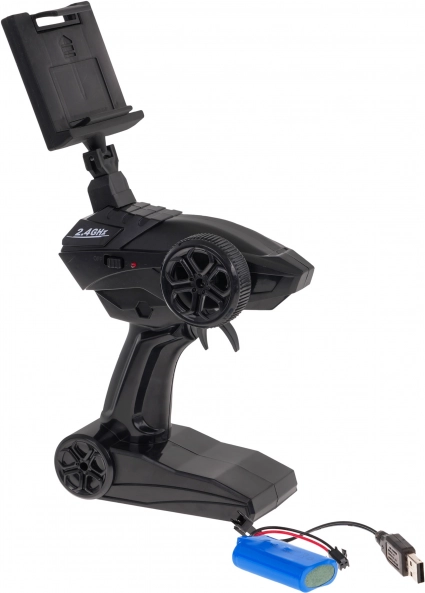 Auto op schaal 1:14 wordt aangedreven door een Li-Pol 3,7V batterij, wat zorgt voor lange gebruiksduur. De ergonomisch gevormde afstandsbediening op 2,4GHz frequentie maakt nauwkeurige besturing mogelijk en de houder voor montage van de telefoon zorgt voor comfort bij het gebruik van de camera.