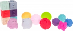 De set bevat genummerde blokken voor de eerste telspelletjes en het stapelen, zachte ballen met rijke structuren en twee dierfiguurtjes (egel en beer) voor fantasierijk spel. Dankzij het zachte materiaal zijn de speeltjes gemakkelijk vast te houden, zelfs voor de allerkleinsten, en helpen ze de grip en oog-handcoördinatie te trainen.