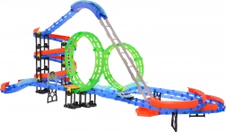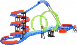 Grote meerlaagse racebaan voor kinderen vanaf 3 jaar met een actierijke rit dankzij twee 360°-lussen, spiralen en scherpe bochten. Inclusief 2 snelle autootjes met verlichting en USB-opladen die rijden over oplichtende fluorescerende baansegmenten. De set bevat 116 bouwdelen voor creatief bouwen en uren speelplezier.
