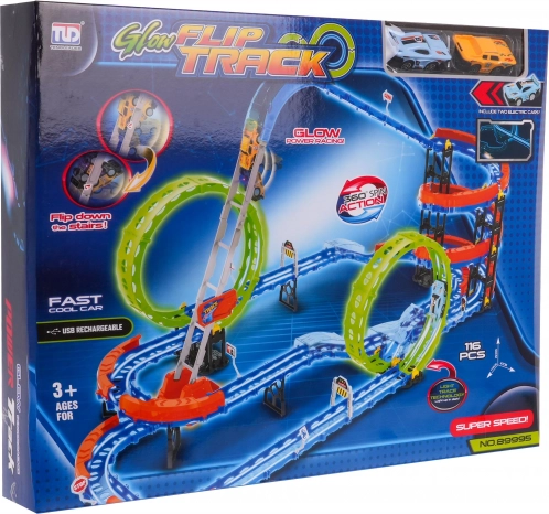Deze kleurrijke raceset biedt kinderen dynamisch speelplezier met steile opgangen, een dubbele 360°-lus en veiligheidsrailingen in de bochten. Dankzij fluorescerende elementen licht de baan op in het donker en wordt het racen nog leuker. Twee lichte raceautootjes met LED-verlichting worden aangedreven door een ingebouwde 3,7 V-accu en laden op via USB.