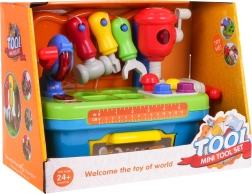 - tafel-werkbank, hamer met functie, hamertje, schroevendraaier, verstelbare moersleutel, cirkelzaag, 2× schroef, 2× spijker, 4× blokje, lade