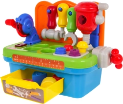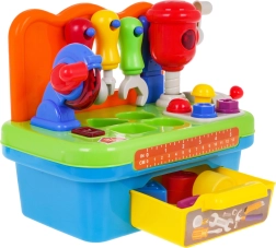 De werkbank biedt veel activiteiten: spijkers intikken, schroeven vast- en losdraaien met schroevendraaier of sleutel en veilig “zagen” bij de zaag. Dankzij de levendige kleuren en de robuuste kunststof uitvoering is hij ideaal voor dagelijks spelen en het ontwikkelen van vaardigheden. Batterijen zijn inbegrepen, dus je kunt meteen na het uitpakken beginnen.