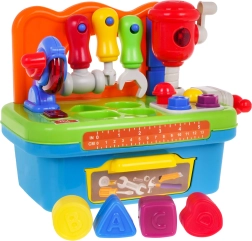 Deze interactieve werkbank combineert plezier en leren in één. Dankzij de licht- en geluidseffecten bij de draaiende zaag en de bewegende hamer is het spel boeiend en realistisch. De bankschroef op het werkblad helpt kinderen bij het oefenen met vast- en losdraaien, terwijl de vormensorteerder de logica en oog-handcoördinatie ontwikkelt. Alle ingegooide onderdelen vind je gemakkelijk terug in de uitschuiflade.