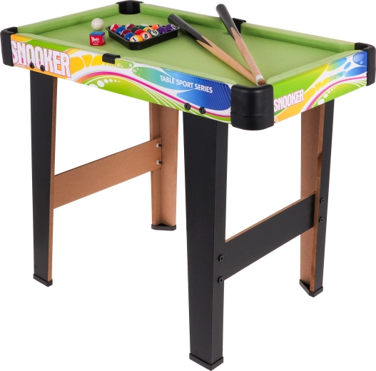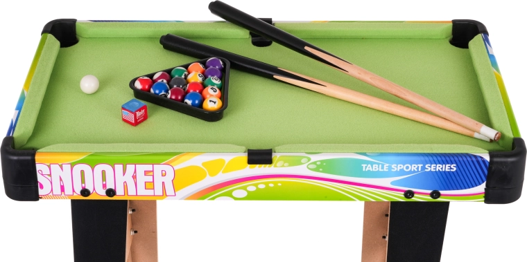 Deze compacte tafel is ontworpen om eenvoudig op elke tafel of vloer te passen. Hij heeft een stevige constructie en wordt geleverd met alles wat nodig is voor direct speelplezier. Spelers zullen de details waarderen, zoals de gaten aan de rand van de tafel waar de ballen in worden geplaatst.
