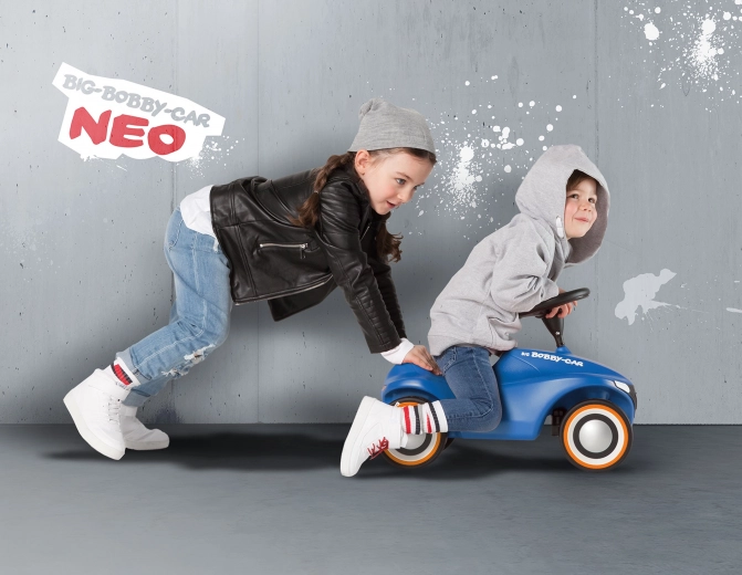 Het Neo-model voegt praktische details toe: een veilig stuur met claxon voor betere controle, een voorste trekhaakoog en een achterste aanhangerkoppeling voor nog meer speelmogelijkheden. Hoogwaardige, tegen UV-straling bestendige materialen en productie in Duitsland staan garant voor een lange levensduur. De veiligheid wordt bevestigd door onafhankelijke LGA/TÜV-tests.