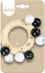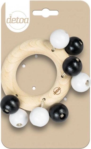 Lichte houten rammelaar met zwart-witte kralen aan een koord ondersteunt de ontwikkeling van de fijne motoriek en trekt de aandacht van baby’s vanaf 6 maanden. Het is veilig, voldoet aan EU-normen, heeft een diameter van 7 cm en is gemaakt in Tsjechië op een ecologische papieren kaart.
