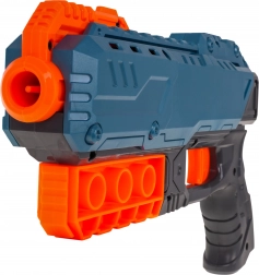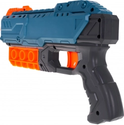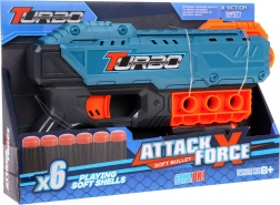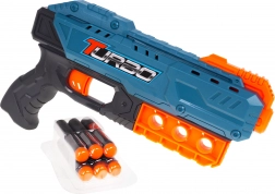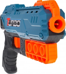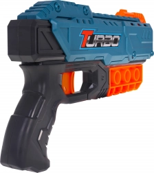 Een leuk en veilig kinderpistool Turbo in het blauw voor kinderen vanaf 8 jaar, met handmatig laden zonder batterijen, zachte foamkogels met rubberen punt en een groot bereik. In de verpakking zitten 6 kogels en op de blaster zitten houders voor snelle reserve.