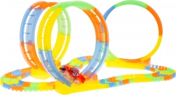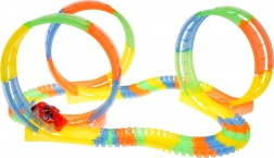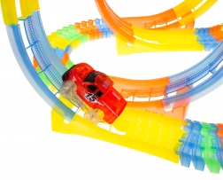Een in het donker lichtgevende racebaan met 3 loopings en een autootje dat deel uitmaakt van de set, geschikt voor kinderen vanaf 3 jaar. De set bestaat uit 148 onderdelen. Er zijn rechte stukken en loopings waar het autootje 360 graden draait. De banen zijn fluorescerend en lichten op in het donker. Het voertuig in de set heeft LED-verlichting; rijden in het donker zorgt voor een geweldig effect. Het voertuig wordt gevoed door 2 x AA-batterijen (niet inbegrepen). Druk op de knop op het dak om de auto te starten. De totale lengte van de baan is tot 468 cm. Laat de race beginnen! |