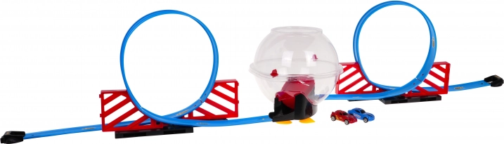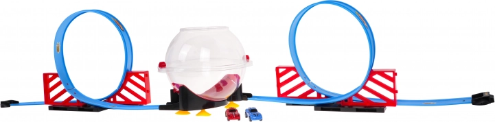 Bouw je eigen race-arena met een dubbele baan, twee loops en een centrale transparante bol. Dankzij de twee onafhankelijke trajecten kunnen kinderen echte snelheidsduels organiseren. Door het autootje naar achteren te trekken activeer je de pull-back-aandrijving en schiet het autootje de loop in, klikt in de bol en maakt binnenin spectaculaire rotaties.