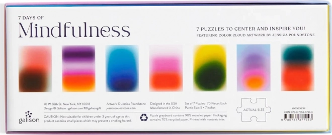 De set “7 dagen mindfulness” biedt zeven originele mini-puzzels met abstracte kleurwolken van JESSICA POUNDSTONE. Elke puzzel heeft 70 stukjes en meet na het leggen ongeveer 17,8 × 12,7 cm – het ideale formaat voor korte, rustgevende puzzelmomenten thuis en onderweg. De verpakking is esthetisch vormgegeven en gemaakt van gerecycled papier, wat liefhebbers van design en duurzaamheid zal aanspreken.