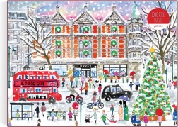 Het ontwerp van Michael Storrings toont de charme van Kerst in Londen met oog voor detail. Deze illustratie brengt een gevoel van feestelijkheid en nostalgie in je huis.