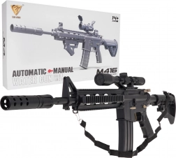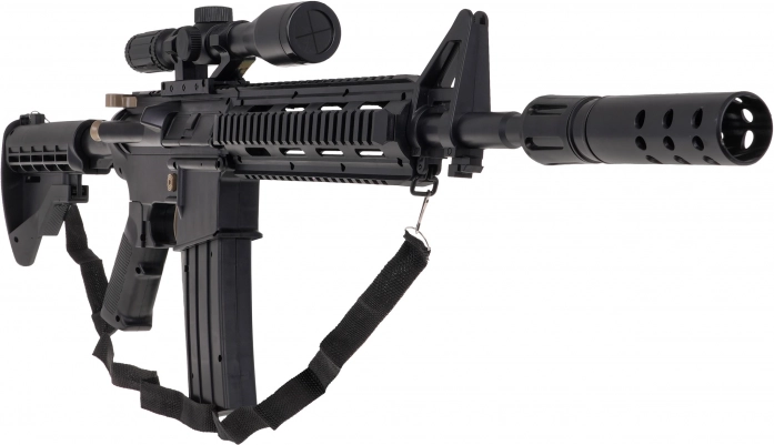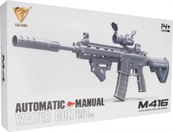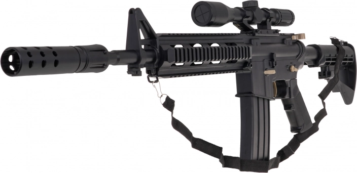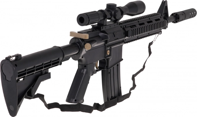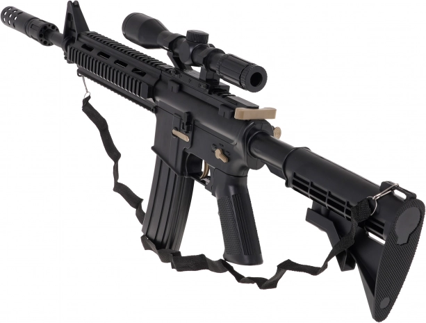 De grote militaire gelkogelgeweer M4 is bedoeld voor kinderen vanaf 14 jaar. Het moet worden gebruikt met speciale hydrogelkogeltjes die uiteenspatten bij het raken van het doel. In dit model dienen kogeltjes met een diameter van 7-8 mm te worden gebruikt. De set bevat een zakje met onvoorbereide kogeltjes. De kogeltjes worden bereid door ze met water te overgieten en ongeveer 4-6 uur te laten staan, daarna wordt het overtollige water afgegoten en zijn de munitiekogeltjes klaar. De geweren hebben een handmatige schietmodus en een automatische modus. De richtkijker van het wapen is uitgerust met een vergrootglas en met een wieltje kunnen we de doelafstand instellen. Het speelgoed wordt gevoed door een 3,7V batterij die bij de set is inbegrepen. |