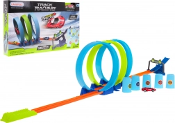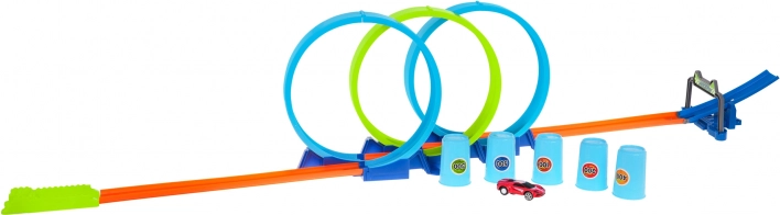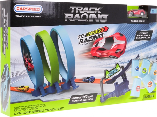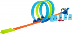 Deze kleurrijke racebaan biedt adrenalinevolle ritten met een drievoudige looping, een sprong van de ramp en het omver rijden van obstakels. Het pull-back autootje is eenvoudig op te winden en rijdt na het loslaten door de loopings richting finish. Ideaal voor kinderen vanaf 6 jaar die van snelheid, stunts en competitie houden.