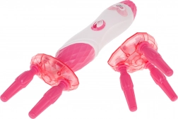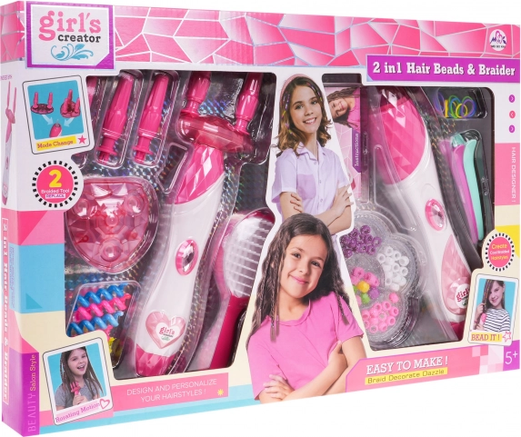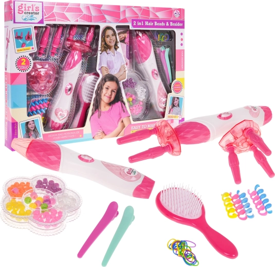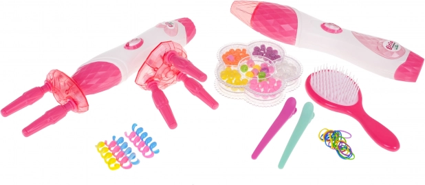 Prachtig uitgeruste 2-in-1 set voor het vlechten van haar en het aanbrengen van kralen, bedoeld voor kinderen vanaf 5 jaar. De set bevat twee hairstylingapparaten. Er is een haarvlechtapparaat en een kralenapplicator voor in het haar, plus een haarborstel, kralen, clipjes en elastiekjes. Het vlechtapparaat werkt op 2 AA-batterijen van 1,5 V (niet inbegrepen) en de kralenapplicator heeft geen batterijen nodig. Het gebruik van de apparaten is zeer eenvoudig. Om vlechten te maken, plaats je eenvoudig 2 haarlokken, en voor vlechten met drie strengen 3 haarlokken, in de openingen van de klemmen en schuif je de diamantknop omhoog. Om een kraal in het haar aan te brengen, plaats je de kraal op de applicator, steek vervolgens een haarlok in het haakje van de applicator en schuif je de diamantknop in het midden van het apparaat omhoog. Houd de kraal vast en verwijder de applicator. Klaar! |