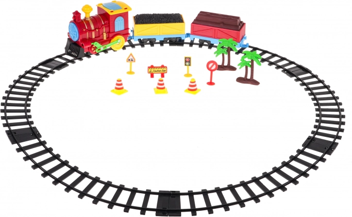 De set omvat 2 wagons (met kolen en met een boom), ronde rails met een diameter van ca. 72,5 cm en accessoires in de vorm van verkeersborden, kegels en boompjes. Eenvoudige montage en robuuste afwerking garanderen vele uren speelplezier en stimuleren de verbeelding.