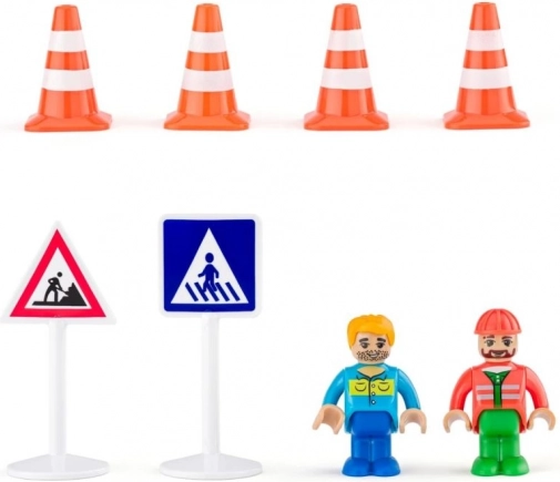 De set bevat voertuigen, figuren en verkeersborden, zodat kinderen meteen hun eigen bouwplaats en fantasierijke scenario’s kunnen creëren.
