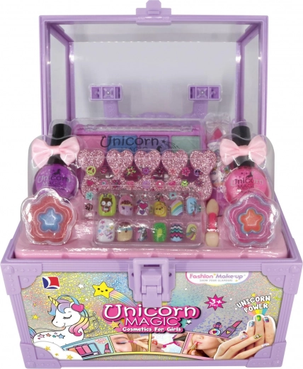 Bevat verschillende kleuren nagellakken, lipgloss en oogschaduw. Alles is verpakt in een decoratieve doos met een eenhoornmotief.