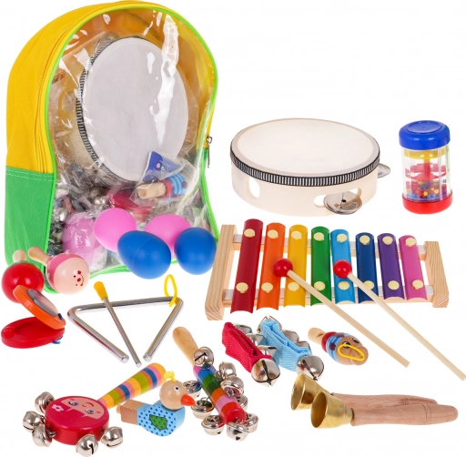 Maak kennis met de grote houten set muziekinstrumenten voor kinderen vanaf 2 jaar. Deze kleurrijke en veilige set bevat 23 verschillende items, allemaal opgeborgen in een praktische rugzak die gemakkelijk mee te nemen is.