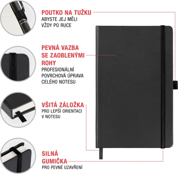 Dit stijlvolle notitieboek is een betrouwbare metgezel voor werk, school en vrije tijd. De harde kaften met duurzame afwerking beschermen je aantekeningen, terwijl de elastische band ze veilig bij elkaar houdt. Het compacte A5‑formaat past in de meeste tassen en rugzakken, zodat je het altijd bij de hand hebt.