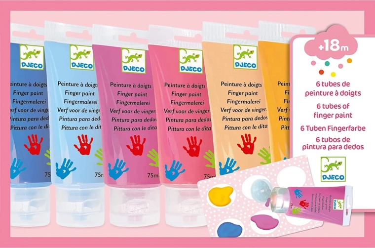 Inhoud van de set: 6 tubes vingerverf (elk 75 ml) en een kunststof palet.