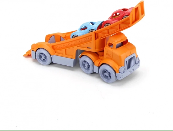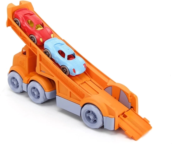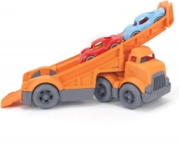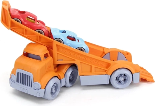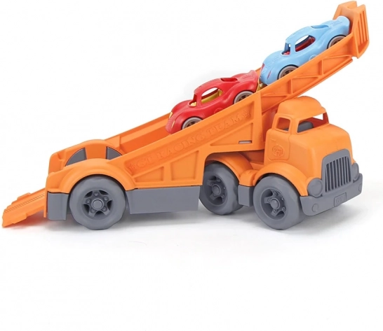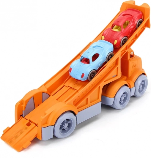 De ecologische transportspeelset van Green Toys biedt veilig en leuk spel voor de kleinsten. De robuuste oranje vrachtwagen met een lange oprijplaat vervoert twee kleurrijke raceautootjes. Gemaakt van gerecycled plastic van melkflessen, vrij van BPA, ftalaten en PVC, geschikt voor thuis, in de zandbak en in water. Eenvoudig te onderhouden – mag in de vaatwasser.