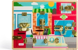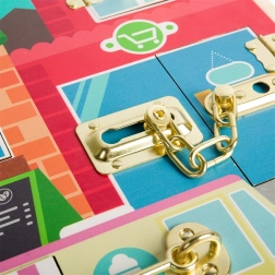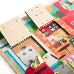 De diverse mechanismen – klapgrendel, schuifgrendel, scharnieren, kettingschuifslot, grendel voor hangslot, draaigrendel en haak met oog – helpen kinderen alledaagse huiselijke sluitingen te begrijpen en verbeteren de precisie van bewegingen. Het bord is gemaakt van verantwoord verkregen hout en duurzame metalen onderdelen.