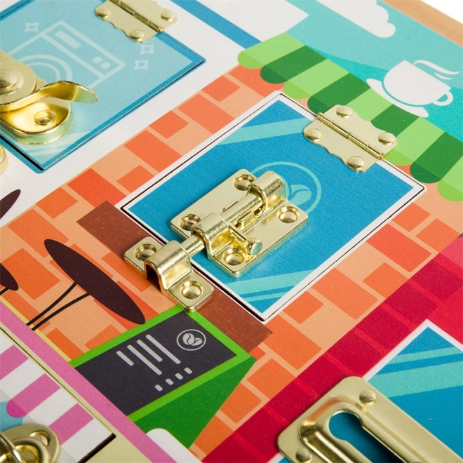 Dit hoogwaardige houten motoriekbord in Montessori-stijl biedt kinderen een veilige ruimte om grip, geduld en probleemoplossend vermogen te oefenen. Achter elk deurtje met een ander type sluiting schuilt een kleurrijke scène (wasruimte, keuken, café en meer) die uitnodigt tot ontdekken en de verbeelding versterkt.