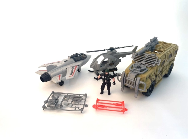 Grote militaire set met gevechtsvoertuig, helikopter en jachtvliegtuig is ideaal voor alle kleine fans van legertechniek en actievolle scènes!