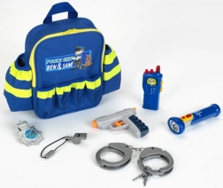- Complete politie-uitrusting: rugzak, zaklamp, portofoon, fluitje, badge, handboeien, waterpistool.
