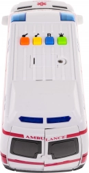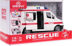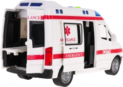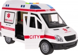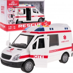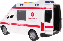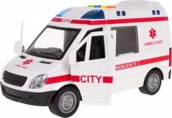 Interactieve ambulance op schaal 1:16 met realistische geluids- en lichteffecten, ideaal speelgoed voor kinderen vanaf 3 jaar. Dit model is uitgerust met bewegende onderdelen, zoals te openen zij- en achterdeuren. De ambulance kan voor- en achteruit bewegen dankzij achterwielaandrijving en de rubberen banden zorgen voor betere grip.