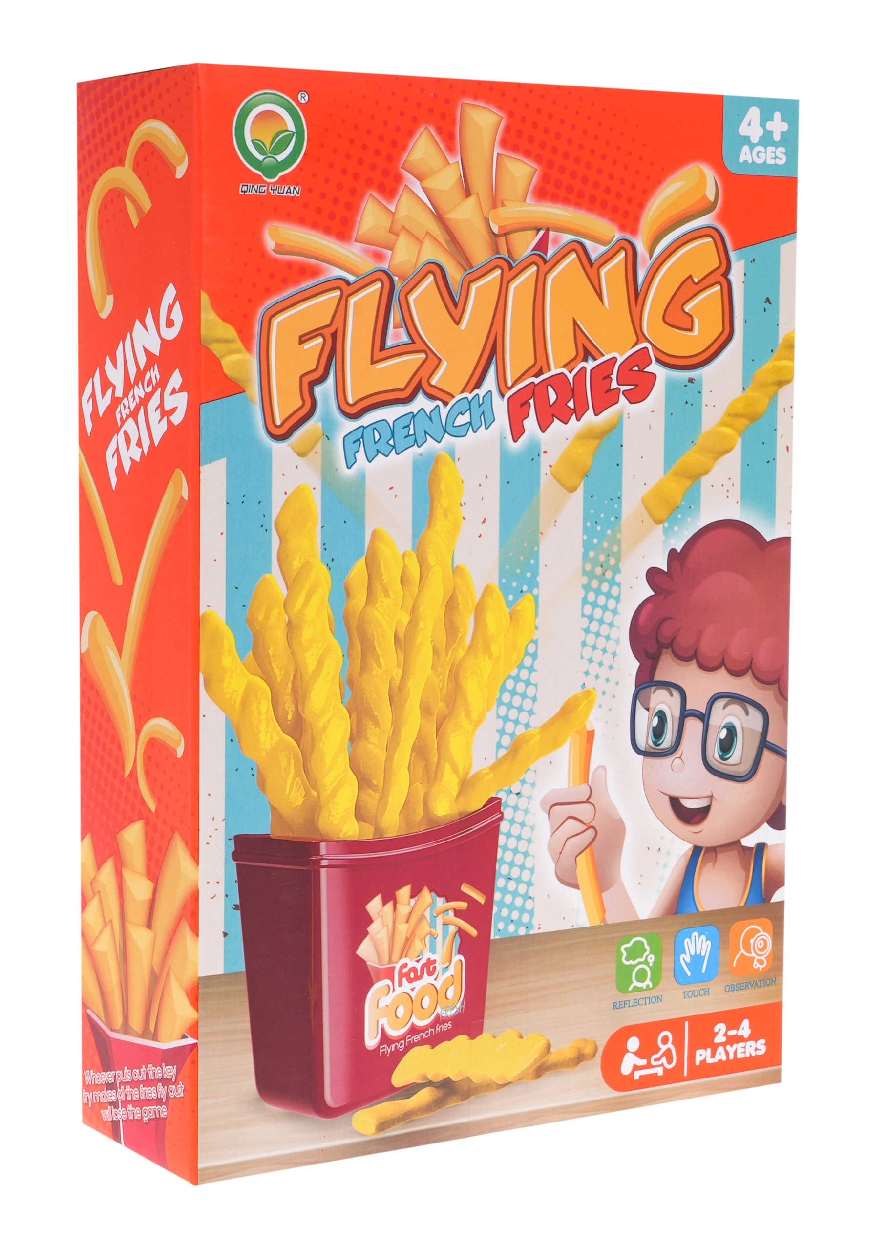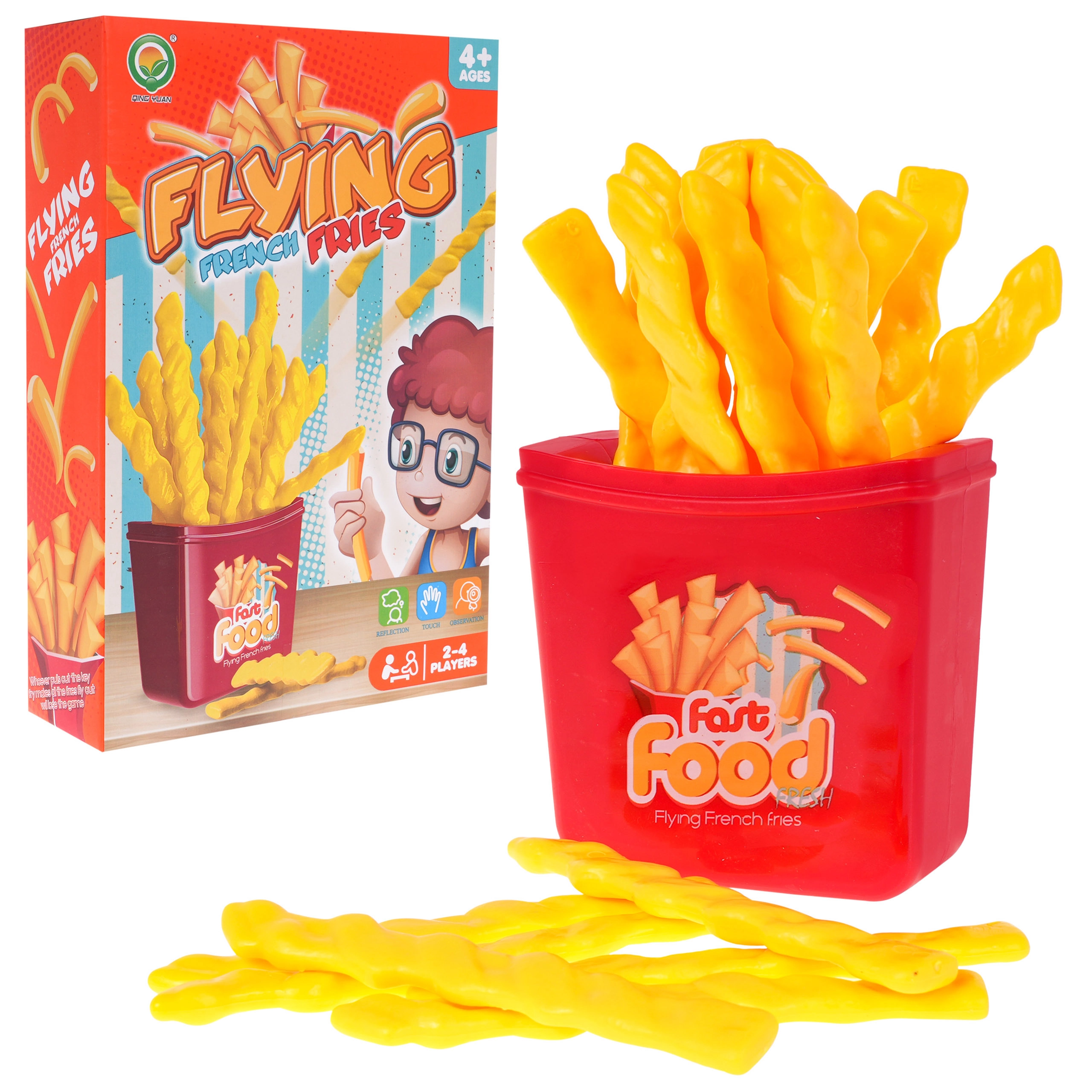 Behendigheidsspel Frietjes is een leuk spel geschikt voor kinderen vanaf 4 jaar en voor volwassenen. Het kan gespeeld worden door 2 tot 4 spelers tegelijk. Het doel van het spel is om het juiste frietje eruit te trekken – kies je verkeerd, dan schieten alle frietjes omhoog!
