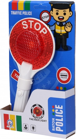 Realistisch politie-stopbordje voor kinderspel en het oefenen van veilig gedrag. De ene kant licht rood op, de andere groen; met lichteffecten en 3× AG13-batterijen inbegrepen. Compacte lengte van 23 cm voor een gemakkelijke grip.