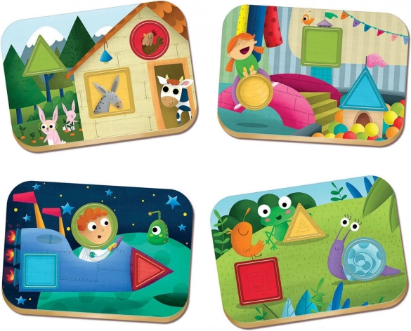 Dit spel bevordert de aandacht van kinderen, ontwikkelt hun verbeeldingskracht en leert hen de basis geometrische vormen en kleuren te herkennen in verschillende omgevingen: op de boerderij, in de speelkamer, in de weide en in de ruimte.