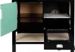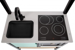 Het kastje onder het werkblad, haken voor het ophangen van keukengerei en een plank waarvan de bodem als rooster kan worden gebruikt, houden alles netjes. Het linkerdeel van het kastje kan dienen als “koelkast” of “vaatwasser”.