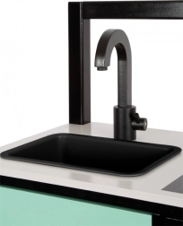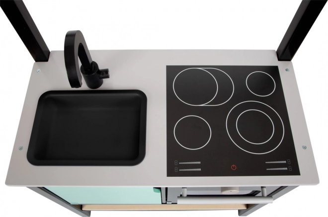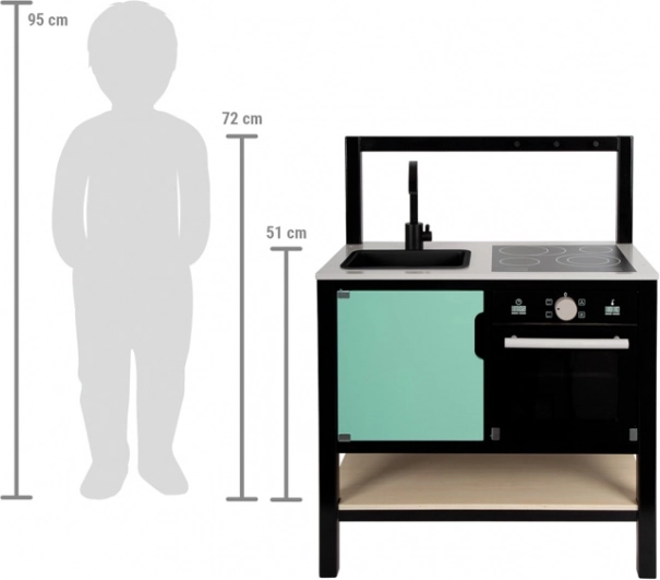 Voor maximaal speelplezier zijn er een wastafelkraan met hendel om de “temperatuur” te regelen, een uitneembare kunststof gootsteen om “af te wassen” en een oven met uitneembare bakplaat. De bodem van de plank kan worden gebruikt als grillrooster. Het kastje onder het werkblad en de haken voor keukengerei zorgen voor orde, terwijl het linkerdeel van het kastje speels kan worden omgetoverd tot “koelkast” of “vaatwasser”.