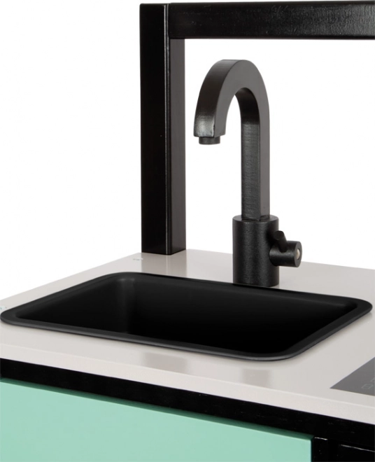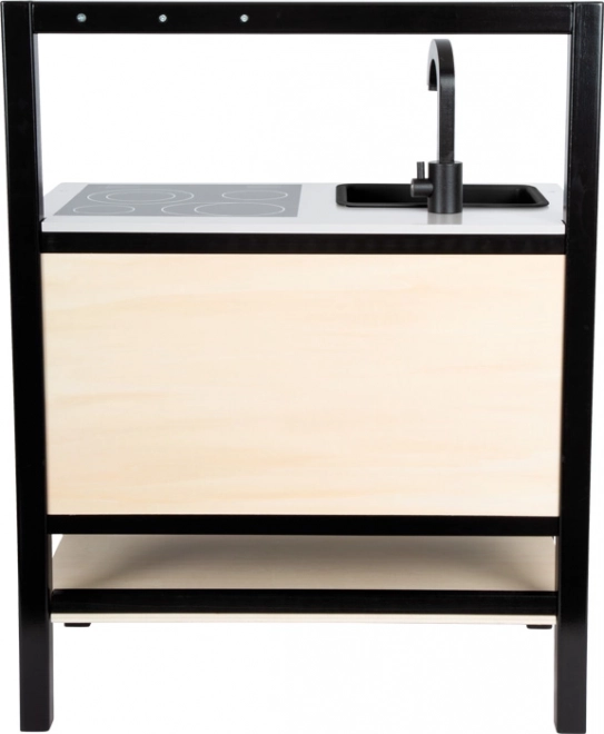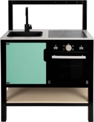 Deze visueel aantrekkelijke kinderkeuken brengt een moderne industriële look die in elke kinderkamer opvalt. De lichte maar stabiele constructie met zwart frame maakt verplaatsen eenvoudig, zodat de speelplek snel kan veranderen. Realistische bedieningsknoppen, geïllustreerde apparaten en functionele elementen prikkelen de fantasie en stimuleren zelfstandig spel.