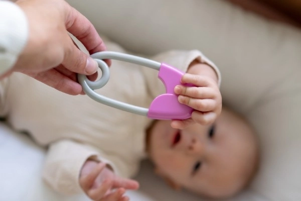 De rammelaar in de vorm van een speld is een onmisbaar onderdeel van de uitzet van ieder kind. Hij is zo ontworpen dat hij gemakkelijk vast te pakken is door kleine handjes en dankzij het lichte gewicht de kinderhanden niet belast. De roze-grijze contrasterende kleuren spreken aan en ondersteunen de visuele waarneming. Kinderen zullen genieten van het zachte gerammel bij elke beweging.
