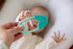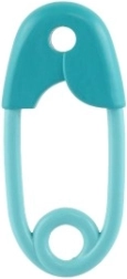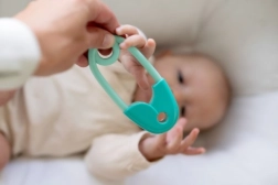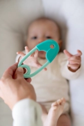 Grote en afgeronde hoeken van de speld zorgen ervoor dat het speeltje volledig veilig is vanaf de geboorte.