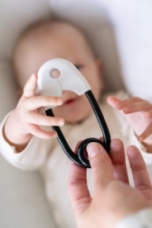 De veiligheidsspeldvormige rammelaar is ontworpen om de fijne motoriek en zintuiglijke waarneming van kinderen vanaf de geboorte te ondersteunen. Dankzij het contrasterende ontwerp trekt het de aandacht van het kind, terwijl de kleine balletjes binnenin een zacht rinkelend geluid maken.