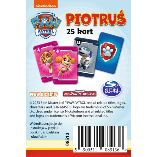 Kaartspel Piotruś met PAW PATROL-thema van het merk Trefl biedt een snel en leuk spel voor kinderen vanaf 4 jaar. Eenvoudige spelregels, favoriete personages en stimulatie van aandacht en concentratie maken dit spel ideaal voor gezellige momenten met het gezin en voor op reis.